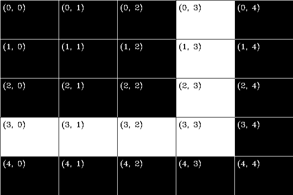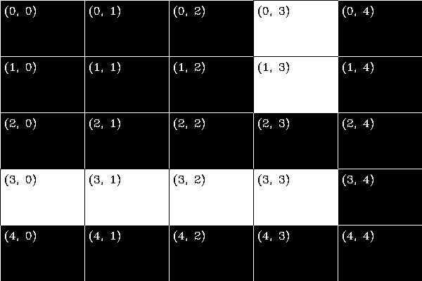 A simple example: Our maze is a 5 x 5 matrix, see left Figure below. In this maze, the white pathway is blocked by a 'sprite' on (2, 3). To remove this blackage we simply have to convert the element of this matrix to white (255). Numpy / cv2 work with (row, col) coordinates, instead of (x, y) and counting starts at 0. Hence the value (2, 3) represents the 3th row and the 4th column value.